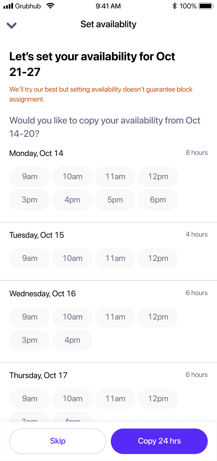The way that Grubhub Drivers work is that they set their schedule every Thursday for the next week. The schedule is open to any and all Drivers. This means that all of the Drivers scramble on Thursday morning and compete to pick the times that work best for them. This creates serious problems for Grubhub's systems and also creates incredible amounts of frustration for the Drivers when they don't get the times that they want to work.